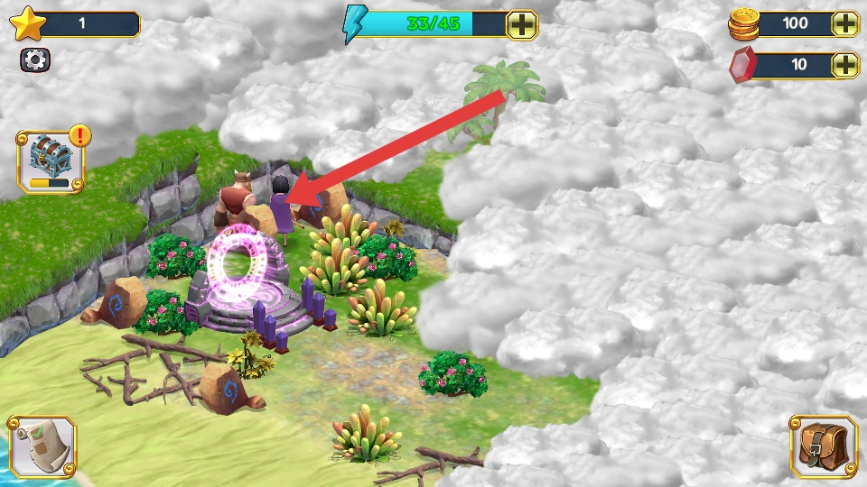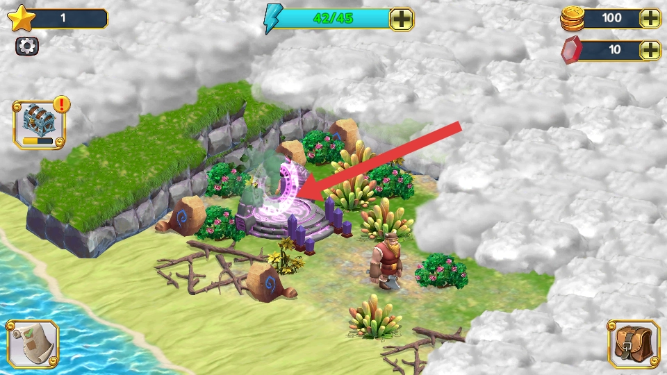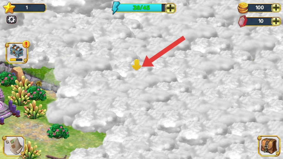 2、对于被云雾遮挡的区域,可消耗闪电能量上方的蓝条来驱散云雾,点击云雾箭头即可解锁新地图,进而收集场景中的金币与红水晶,用于升级道具。
