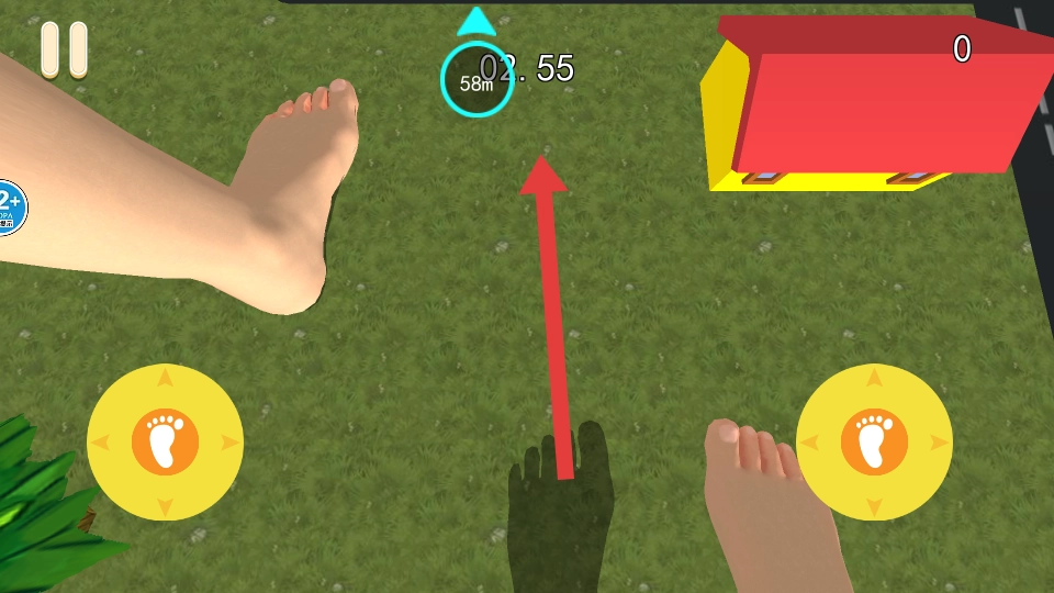 1、通过点击左右脚印按钮,朝着带有蓝色箭头和距离标识的目标点移动,需在倒计时结束前准时到达以完成关卡,不断刷关卡来积累进度。