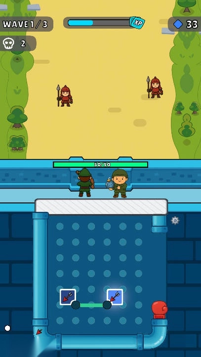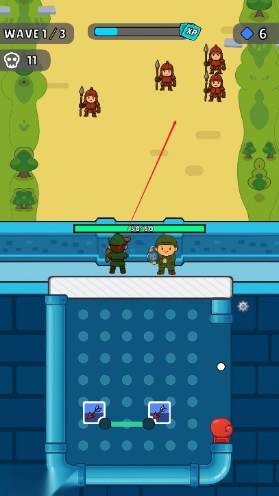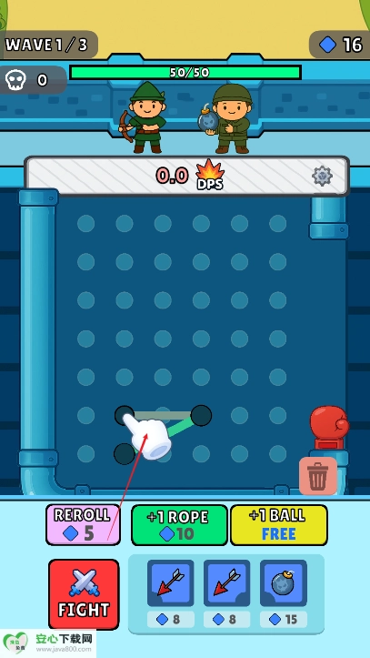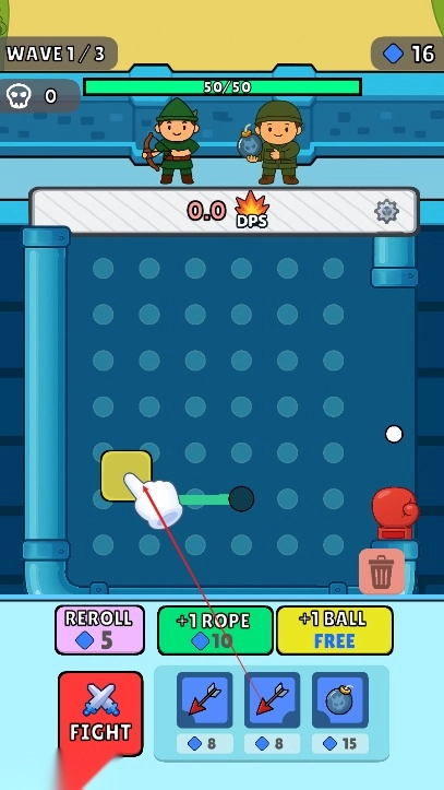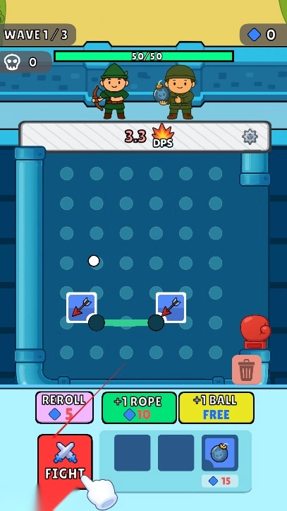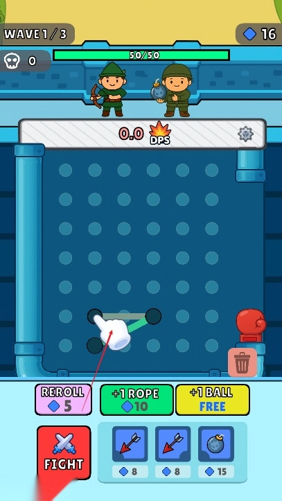 绳索连接与轨迹引导:在网格地图上拖动绳索完成连接,搭建出各异形态的路径,以此引导弹跳球的运动轨迹。通过调整绳索的角度与节点位置,使弹跳球精准撞击目标、触发机关或是反弹到敌军密集区域,借助物理碰撞原理达成大范围攻击,考验玩家对空间布局和物理轨迹的预判能力。
