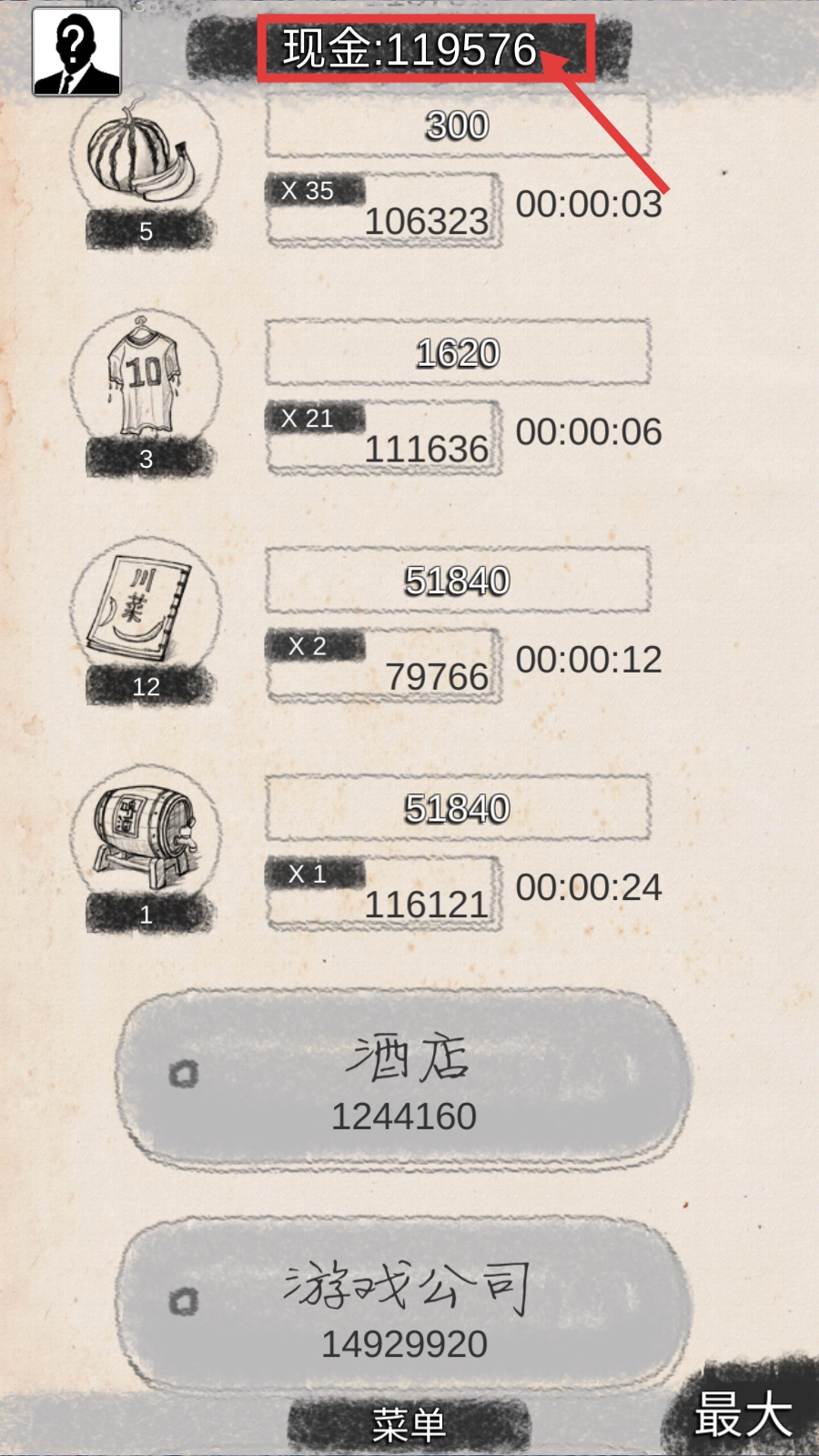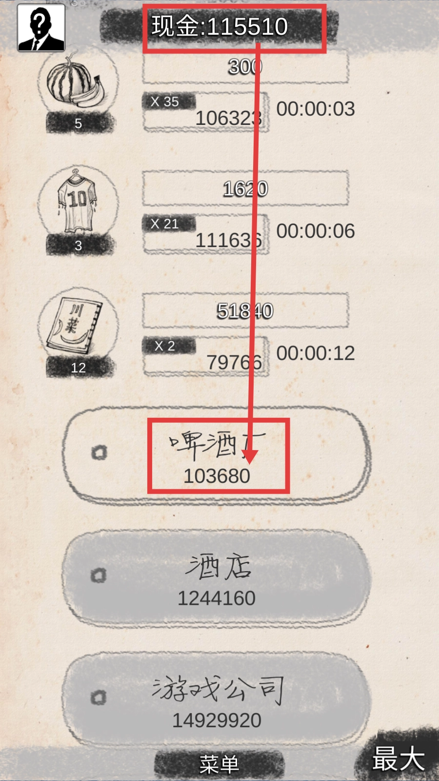 2、当现金积累到115510时,投资【啤酒厂-103680】项目,以拓展高收益产业的布局。