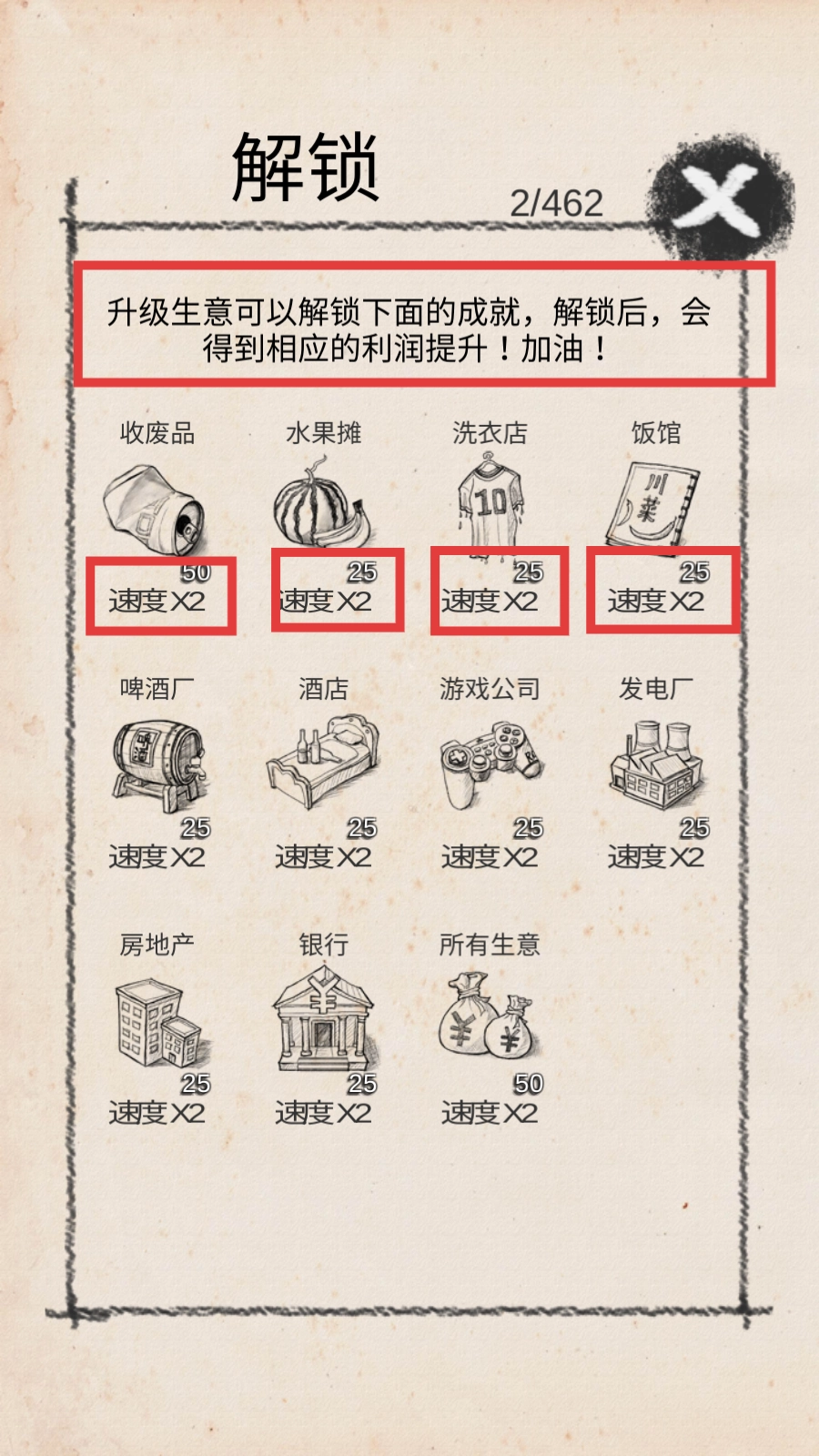 1、升级【收废品】【水果摊】这类生意并解锁对应成就后,能获取【利润速度×2】的增益效果,为产业发展提供助力。