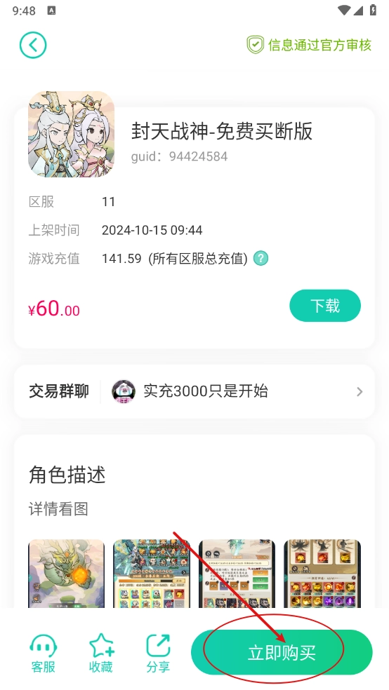 5、一键开启后查看交易详情,点击“立即购买”按钮即可。