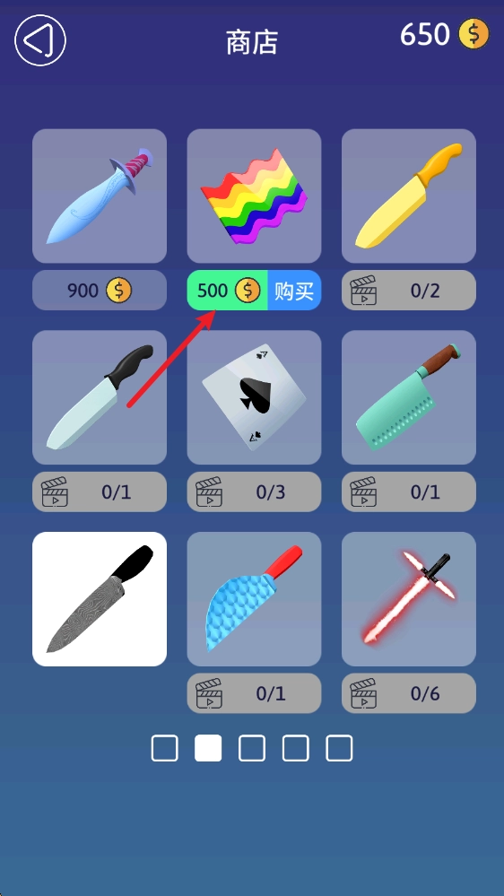 进入后便能看到已解锁的刀具,也可以花费金币进行购买。