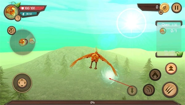 1、进入游戏后,首先要熟悉虚拟按键的操作逻辑,借助这些按键来控制凤凰完成起飞、转向以及升降的动作。建议在初始场景里多进行飞翔练习,亲自体会凤凰操控时的灵活度。
