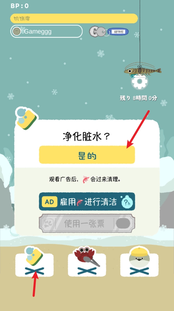 3、也可以选择观看广告来召唤虾,让它们帮你持续进行清理工作。