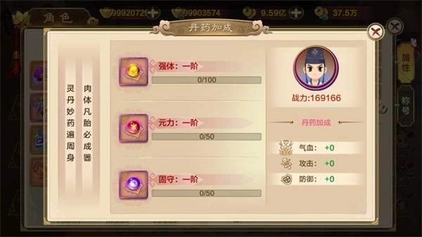 在角色丹药加成的界面里,能够看到当前所拥有的丹药加成效果,以及丹药加成的上限数值。