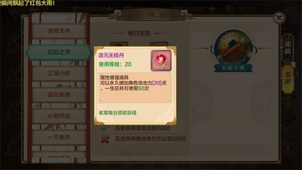 从后起之秀开始,角色将获得永久增加属性的丹药。