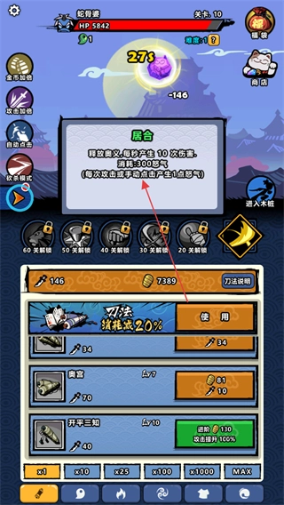 1、战斗过程中会触发屈合机制,该机制能对妖怪造成多次伤害,而且每次点击屏幕进行攻击时还会积累怒气。