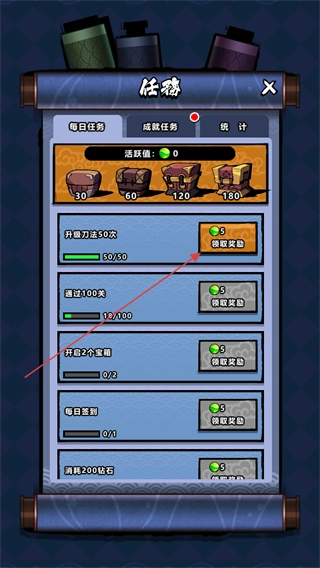 4、每日需完成挥刀万次这类任务50次,完成后点击“领取奖励”即可获取资源,这些资源能助力角色成长。