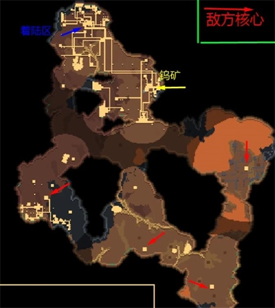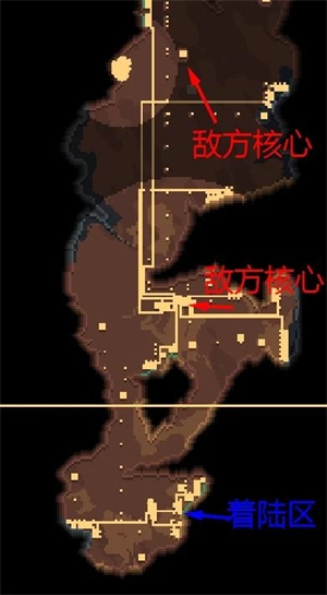 这时候敌人会朝你着陆点的核心扔核弹,所以一定要确保你在其他位置也造了备用核心。紧接着下方区域就解锁了,你可以直接先推着陆点下方的敌方核心,然后囤积兵力。下方的两个核心防御比较强,建议用钨弹撕裂弹来对付。另外,推掉一个敌方核心后,记得在那块区域留个单位或者建点东西,不然敌人会重新生成核心的。