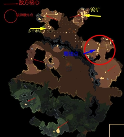 7、风蚀盆地:第七关的难度比较微妙,说难不算特别难,说简单也绝非易事——敌人甚至会动用核弹攻击你。开局先把基地建设完善,首要任务是摧毁左上角的两个敌军基地,基地下方的路径暂时不用理会,因为任务一没完成的话,下方区域不会解锁,那里的敌人也不会行动。造兵前得先把基地左边的防御工事做好,毕竟左上的敌人还是会出兵骚扰的;之后就可以开始造兵了,这时候基地大概率会缺电,不过左边(图里黄色箭头标注的位置)有好几个水坑,正好可以用来建发电设施。