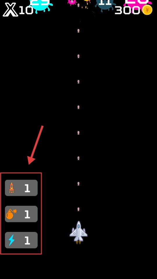 游戏里左侧设有【火箭-道具】【炸弹-道具】【闪电-道具】的道具栏,要留意查看各道具的剩余数量哦。