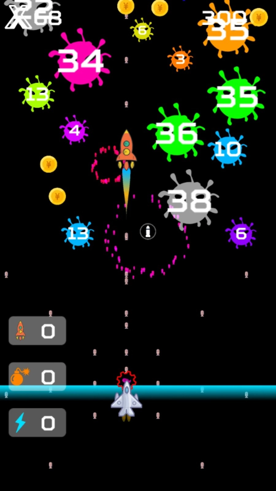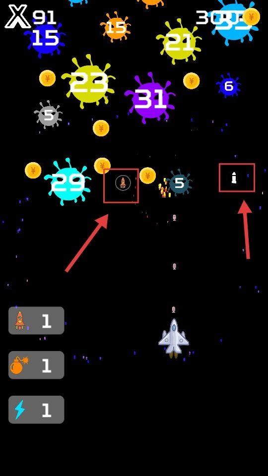3、操控飞机攻击带有数字标识的【病毒-敌人】,与此同时收集【金币】,还要记得拾取空中的道具。