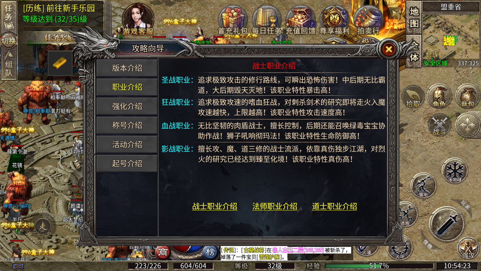 3、血战职业:堪称无比坚韧的肉盾战士,不仅擅长控制,到了后期还能召唤绿毒宝宝来协助作战!其狮子吼更是响彻整个玛法大陆!该职业的特性在于拥有极高的生命值与防御力!