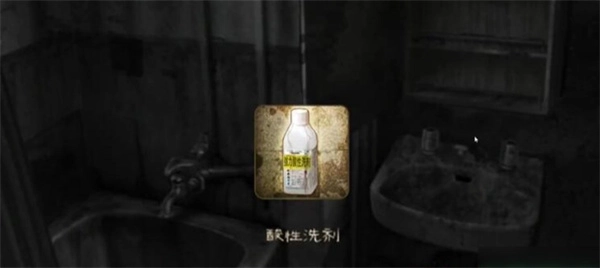 9. 继续探索至浴室,在橱柜内找到一瓶酸性清洁剂。