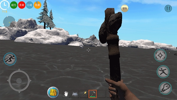 3、界面左上角显示角色的耐力值,下方设有持续奔跑和自由移动的轮盘;右侧分布着瞄准、跳跃与攻击功能键,各操作区域区分度较高;底部是物品栏,点击手形按钮即可拾取道具。