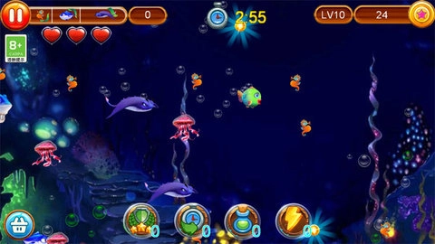 1、在游戏里,玩家得操控一条小鱼,靠着持续吞食体型比自己小的鱼来实现成长。