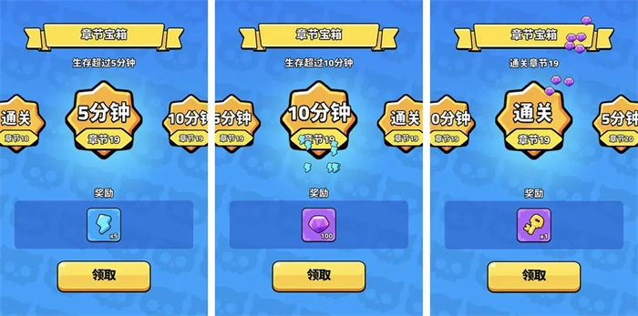 每次通关后记得领取奖励,里面会有一把宝箱钥匙,奖励分为5分钟、10分钟和15分钟这三个档位。
