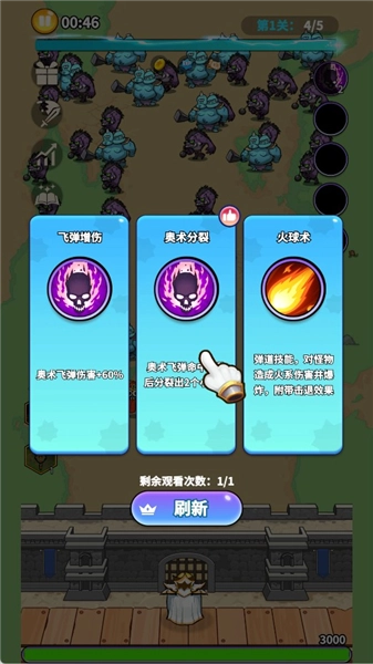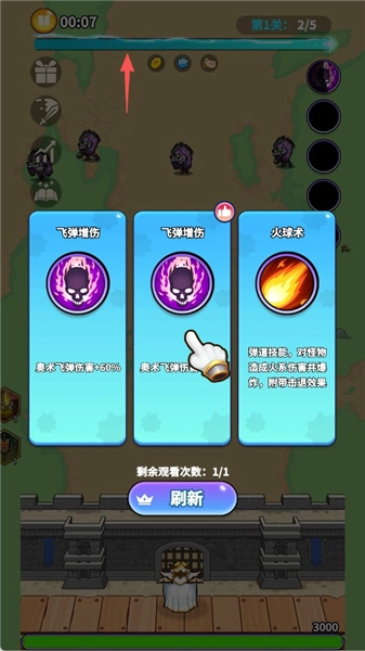 2、当上方能量条满了之后会触发技能选择,建议优先选择“飞弹增伤”类技能,可显著提升输出效率,加快清怪节奏。