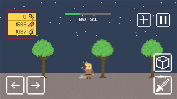 1、首先进入游戏,可以看到肉类、木材还有石头都是0;