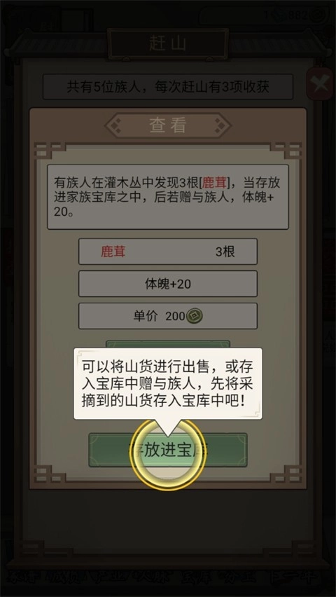 9、采摘完成后,将山货放入 宝库,可选择出售或赠与族人。