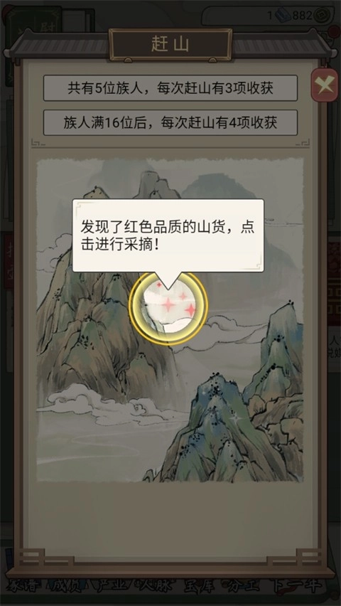 8、在赶山过程中发现红色品质山货时,点击采摘即可。
