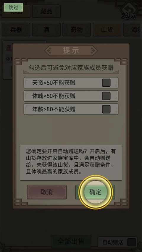 10、进入宝库后,点击 自动赠送,系统会优先赠送给体魄最高且满足条件的家族成员。