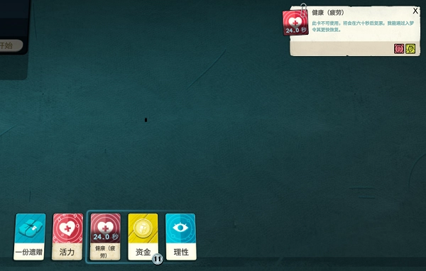 5、使用健康值进行工作后,你会发现健康状态陷入疲劳,此时点击健康选项,右上角会显示距离恢复还需多长时间。此外,用健康值工作还能获得活力牌,不过活力牌有保质期,它在桌面上仅能停留3分钟,要是3分钟内没有使用,就会自动消失。