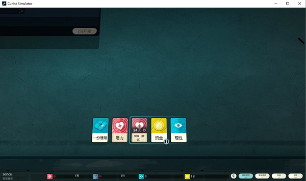 8、时间流逝(橙色方块)每60秒都会消耗掉一个金钱。吸铁石标志代表着自动获取,也就是不由玩家控制。当吸不到金钱的时候,时间流逝会将健康转化成饥饿,如果没有健康可以转化,主角就会饿死,游戏结束。饥饿可以用金钱还原成健康,但如果一直没被还原,饥饿就会转化为衰老。衰老只能通过仪式还原。时间流逝的右下角符号代表着当前季节,点击它可以查看季节说明。通过季节说明可以得知当前高发的概率事件。