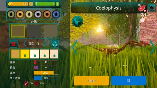 3、自定义的装扮系统,捏造专属的恐龙形象,在左边可以编辑各种外貌和颜色。