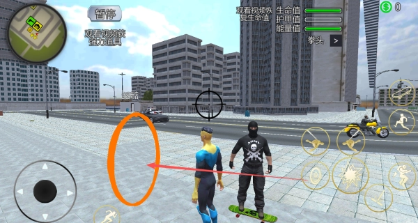 1、用虚拟摇杆控制角色移动,点击右侧绳索技能按钮发射绳索,钩住高楼实现空中穿梭,快速遍历城市角落。