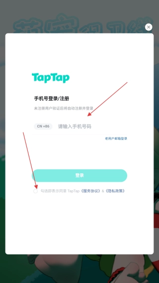 1、打开游戏登录界面,在“请输入手机号码”输入框中输入手机号码,并勾选同意《服务协议》与《隐私政策》。