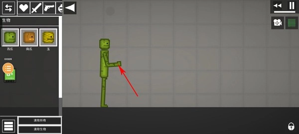 接着把胳膊抬起来,双击西瓜角色的胳膊,会弹出删除、冻结、静置碰撞、启用这些选项,选择冻结后,胳膊就会固定住不动了。