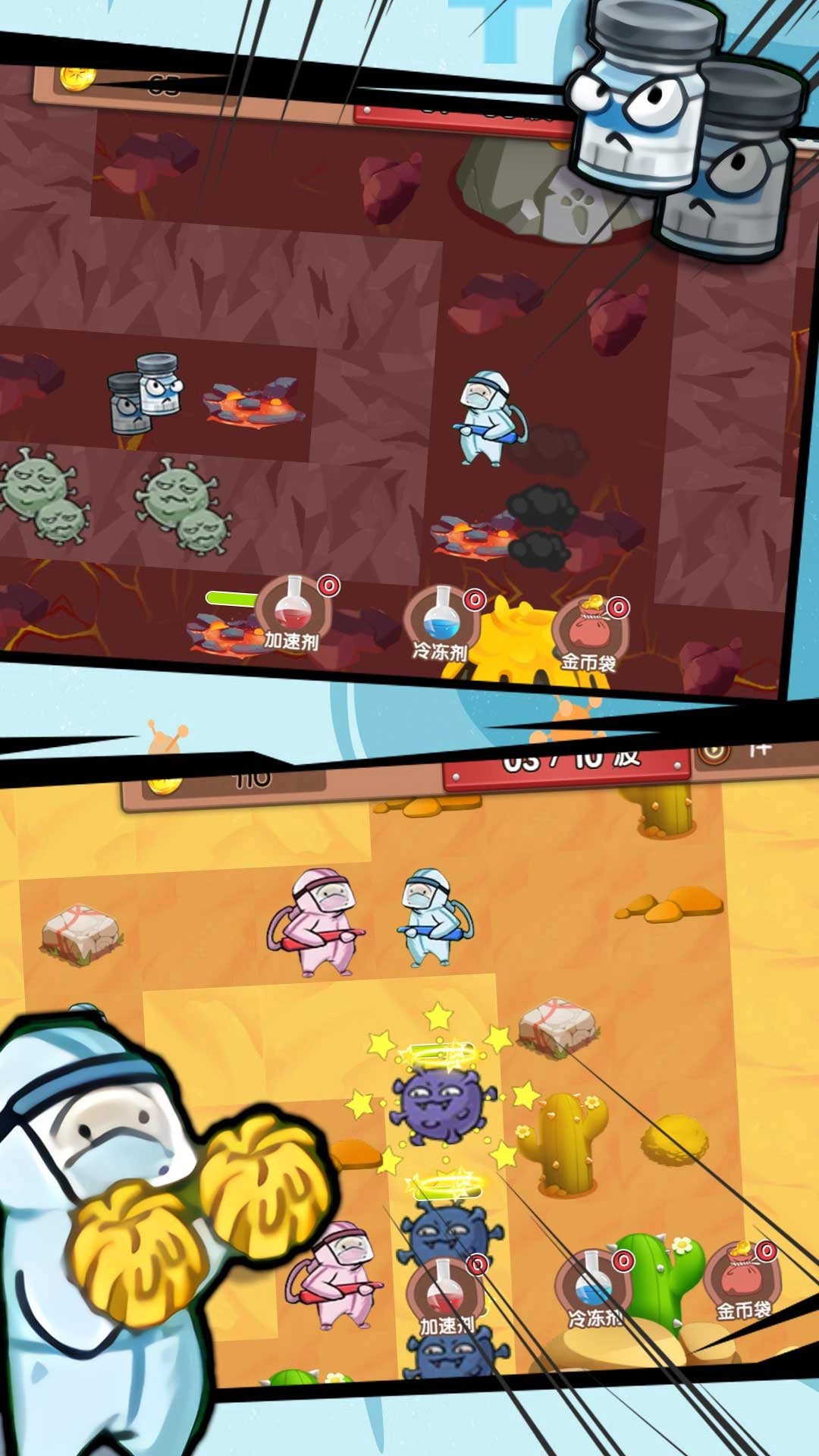 设置加速剂、冷冻剂这类辅助道具,通过策略性的方式干扰病毒的进攻节奏。