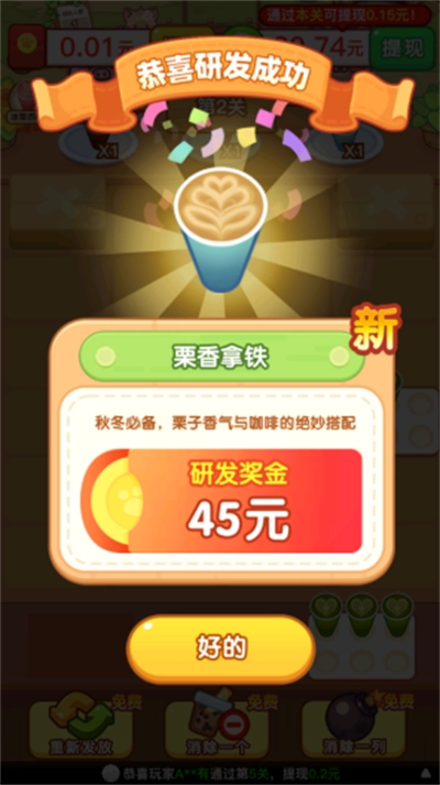 每通过一关都能发现惊喜红包,完成挑战就能收入囊中;随着关卡升级,还会解锁更多口味的奶茶配方,让合成过程始终充满新鲜感与乐趣!