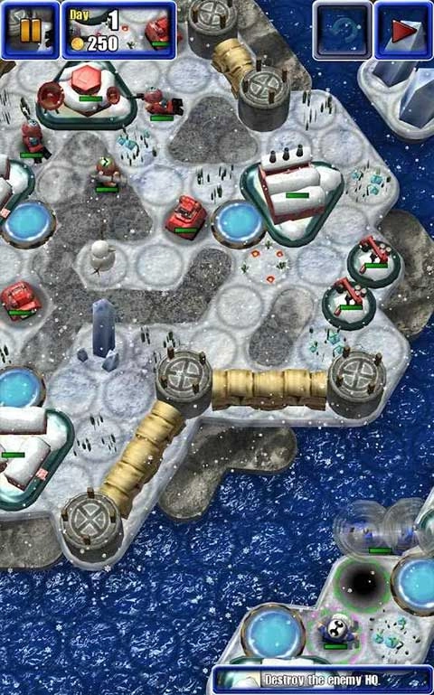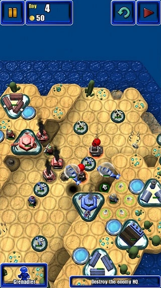 第五天,敌方已没多少资金可用于出兵,敌人也大多只剩残血,此时手雷兵和直升机可肆意收割,再派出炮兵或轰炸机炸毁对手总部即可。