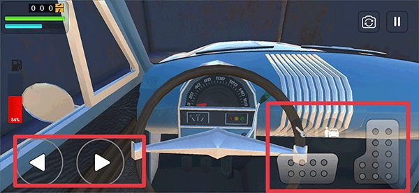 上车后就能驾驶车辆在路上行驶了,左边的按键用来控制方向,右边的按键则分别负责倒车和前进。