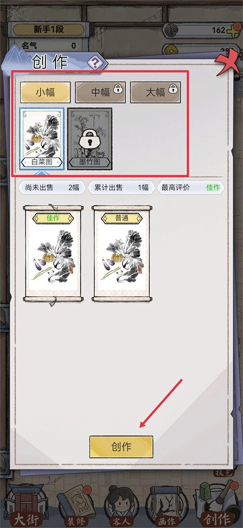 双击打开水墨记游戏后,你需要经营一家画室,经营的第一步是创作画作,点击右下角的“创作画作”按钮即可开始。