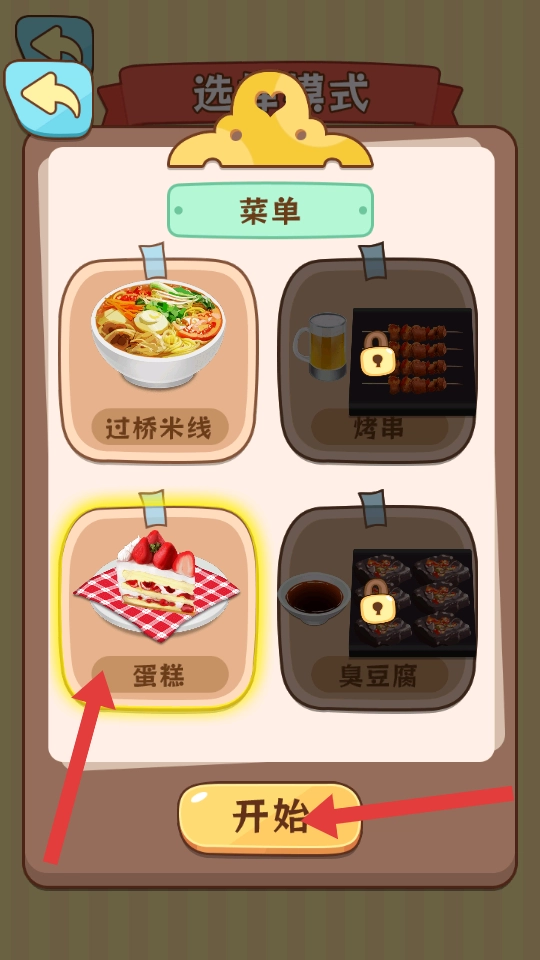 当进入选择食物的界面后,你会看到过桥米线、蛋糕等选项罗列在菜单中。你可以从中挑选自己想品尝的品类,假设你选择了蛋糕,接着点击开始按钮,就能进入实际的用餐流程了。