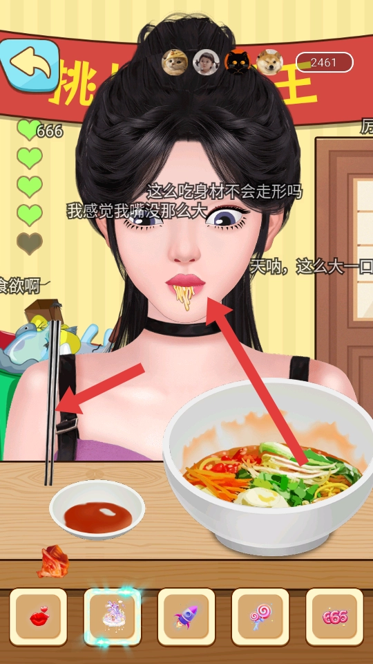 开始享用所选的食物,例如蛋糕,用筷子之类的工具夹起食物送进嘴里,与此同时还能看到屏幕上的互动评论,以此增添游戏的趣味性。