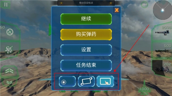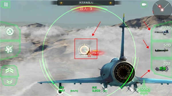 发现敌方目标后,我们立即加快速度缩短距离,对其进行瞄准锁定,随后点击侧边的攻击选项,既可以选择机枪进行扫射,也能够使用导弹实施轰炸。