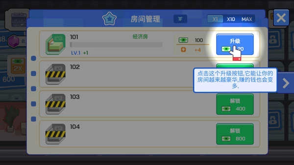 2、快速升级所有的房间,为你带来更多赏金奖励,让所有的房间都有客人入住。