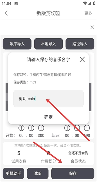 剪辑完成后点击保存按钮,在弹出的对话框中输入自定义的音乐名称(例如“剪切coin”),确认好保存路径与文件类型,即可完成音频剪辑的导出操作。