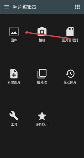 打开照片编辑应用后,在主界面的各类功能选项中,找到并点击图库按钮,接着从手机图库内选择需要进行编辑的图片。