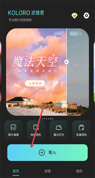 打开滤镜君应用后,在主界面的下方区域找到导入按钮,点击这个按钮,接着从手机里挑选出想要进行滤镜处理的图片。