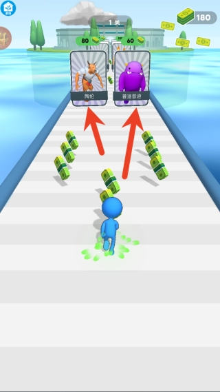 通过滑动屏幕来控制角色在跑道左右移动,收集金币和材料,同时避开障碍物。