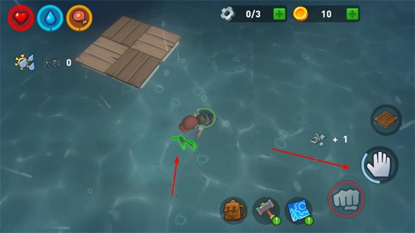 在漂流于海面的木筏上求生时,需要留意生命值、水分值这类状态指标,避开鲨鱼等具有威胁性的生物,以此确保自身的生存安全。