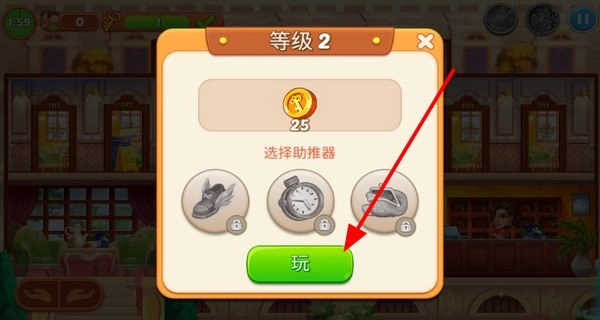 等级升到2级后,就能挑选助推器,接着点击“玩”,进入该等级对应的酒店经营环节。