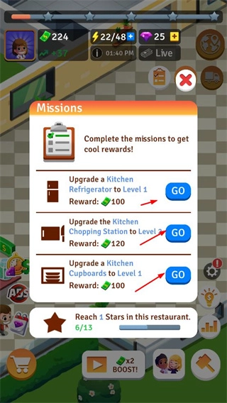 完成任务,获取金币、钻石等奖励,助力餐厅发展。
