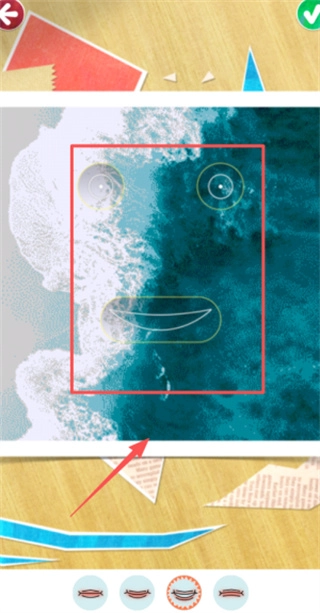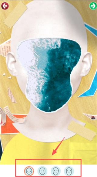 进入造型设计环节后,需依照红色粗箭头的指引,在照片中下部区域开展操作,可从底部被橙色圆环包裹的开心嘴表情库中挑选适配的部件,以完成创作。